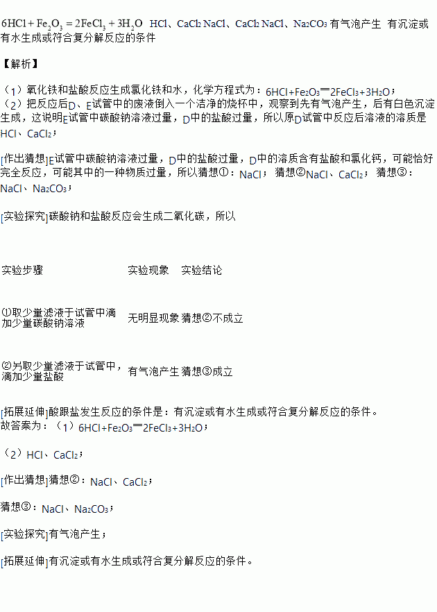 (2)小王同学把反应后D、E试管中的溶液倒入一个洁净的烧杯中,观察到先有气泡产生,后有白色沉淀生成。过滤,得到白色沉淀和无色滤液。