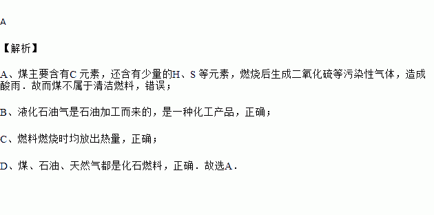 A.煤中主要含有碳元素,还含有氢、硫等元素,煤是清洁燃料