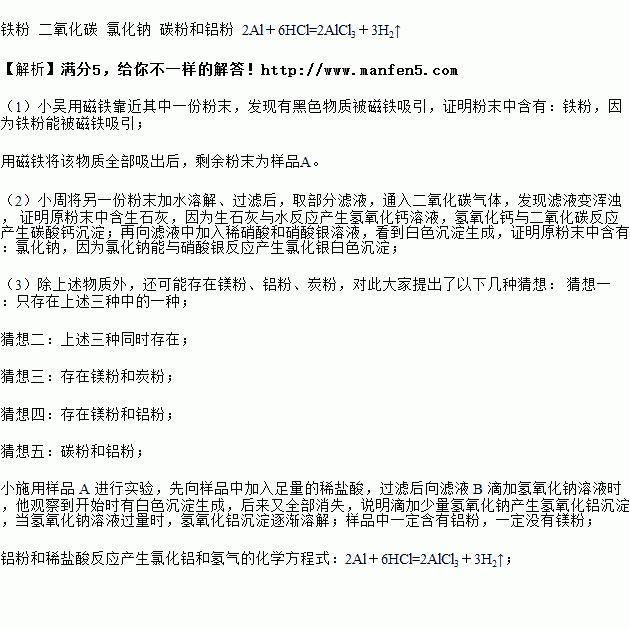 (3)除上述物质外,还可能存在镁粉、铝粉、炭粉,对此大家提出了以下几种猜想: 猜想一:只存在上述三种中的一种;