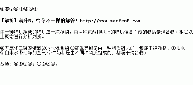 在下列物质①盐水 ②自来水 ③洁净的空气 ④五氧化二磷 ⑤液氧⑥牛奶 ⑦冰水混合物 ⑧红磷 ,属于纯净物的是:_____________,属于混合物的是:_______________。(用序号填空)
