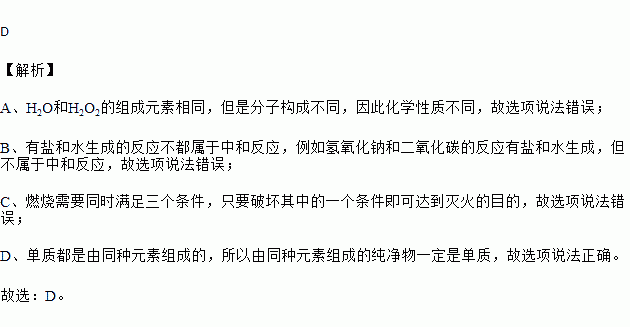 D.单质都是由同种元素组成的,所以由同种元素组成的纯净物一定是单质