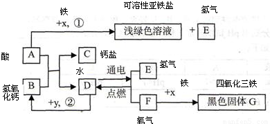 【答案】分析:(1)根据D和E、F可以相互转化,又是有中和反应生成的,所以D就是水,F会与X反应生成黑色固体,所以F就是氧气,E就是氢气,Y常用作食品干燥剂,会与水反应生成B,所以Y就是氧化钙,B就是氢氧化钙,A、B可发生中和反应,A就是酸,A和X反应会生成浅绿色溶液和氢气,所以X就是铁,G就是四氧化三铁,将推出的物质验证即可.