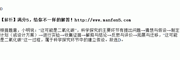 现有一瓶失去标签无色气体,老师让同学们判断其是氧气还是二氧化碳,小明说:“可能是二氧化碳”。小红说:“用一根带火星的木条就能检验”。就小明的话来说,其属于实验探究过程中的( )