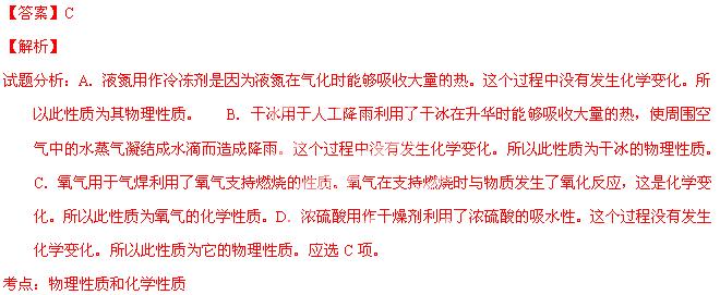 C.氧气用于气焊 D.浓硫酸用作干燥剂