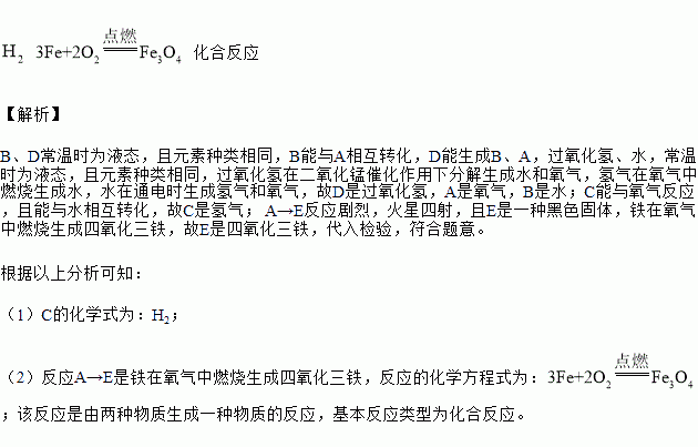 已知A、B、C、D、E是初中化学常见的五种不同的物质,其中B、D常温时为液态,且元素种类相同,A→E反应剧烈,火星四射,且E始终黑色固体(说明“——→”表示转化,“——”表示相互之间能反应)。根据如图所示回答下列问题: