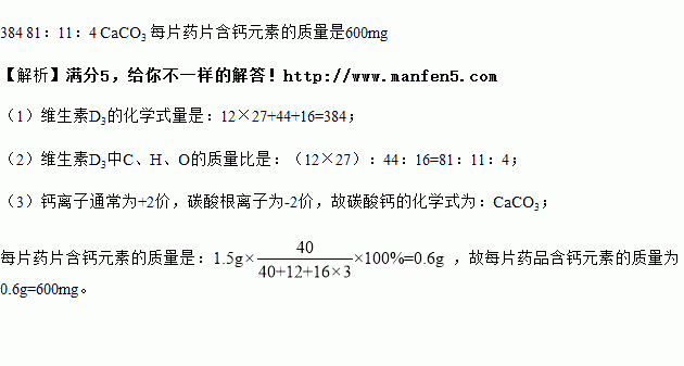 (1)维生素D3的化学式为C27H44O,则维生素D3的化学式量是多少____?
