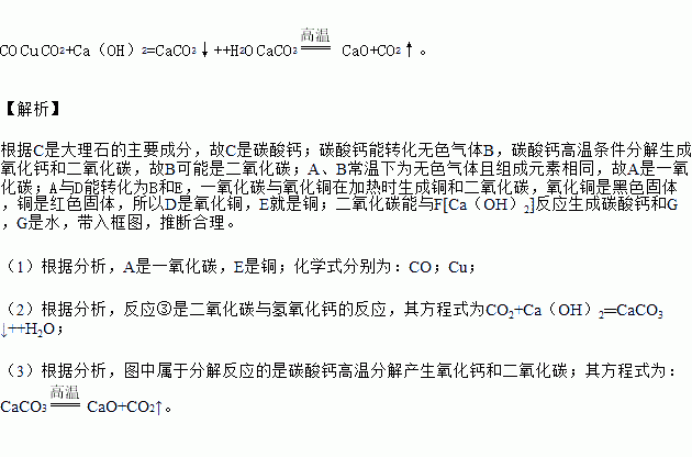 A~G是初中化学中常见的物质,其转化关系如图所示,部分反应物、生成物和反应条件已略去。其中A、B为无色气体且组成元素相同,C是大理石的主要成分,F是Ca(OH)2,D为黑色固体,E为红色固体。试回答下列问题: