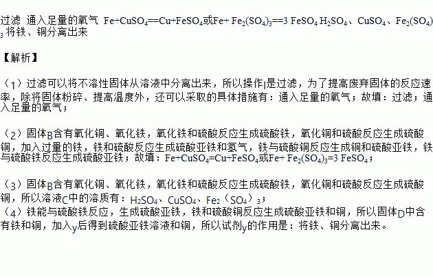 利用某工业废弃固体(成分为Cu2S和FeS2)制备硫酸铜溶液和硫酸亚铁晶体,流程如图所示。(已知:①固体B含有氧化铜、氧化铁 ②铁能与硫酸铁反应,生成硫酸亚铁)