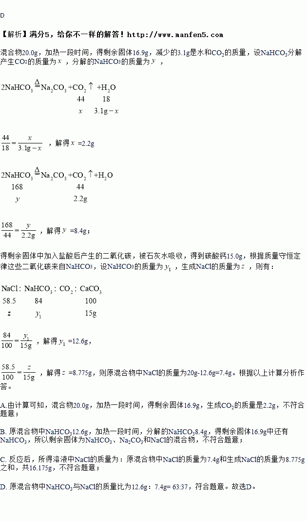 ÓÐNaHCO3ÓëNaClµÄ»ìºÏÎï20.0g£¬¼ÓÈÈÒ»¶Îʱ¼ä£¬µÃÊ£Óà¹ÌÌå16.9g¡£ÏòÊ£Óà¹ÌÌåÖмÓÈë×ãÁ¿Ï¡ÑÎËᣬ²¢½«¸Ã·´Ó¦Éú³ÉµÄÆøÌåͨÈë³ÎÇåʯ»ÒË®ÖУ¬µÃµ½°×É«¹ÌÌå15.0g£¬ÏÂÁÐ˵·¨ÕýÈ·µÄÊÇ£¨ £©
