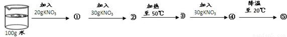 £¨4£©Ð¡Ã÷ÔÚ20¡æÊ±½øÐÐÁËÈçÏÂʵÑ飬Ôò£º¢ÙÒÑÖªÔÚ20¡æÊ±ÏõËá¼ØµÄÈܽâ¶ÈΪ31.6¿Ë£¬Ôò20¿ËÏõËá¼ØÈ«²¿Èܽ⣻¢Ú30¿ËÏõËá¼ØÖ»ÄÜÈܽâ11.6¿Ë£»¢Û¼ÓÈÈÖª50¡æÊ±£¬50¿ËÏõËá¼ØÈ«²¿Èܽ⣻¢ÜÔÙ¼Ó30¿ËÏõËá¼Ø£¬È«²¿Èܽ⣬ÒòΪÔÚ50¡æÊ±£¬ÆäÈܽâ¶ÈΪ85.5¿Ë£»¢Ý½µÎÂÖÁ20¡æÊ±£¬Óɾ§ÌåÎö³ö£¬Ö»ÄÜÈܽâ31.6¿Ë£®¹Ê¿ÉÖªÕýÈ·´ð°¸£®