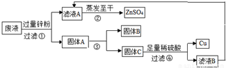 (2)由于滤液A、B蒸发至干得硫酸锌,可得知两滤液中的硫酸锌皆为硫酸锌;固体C加入过量的稀硫酸得到滤液B和铜.由上述分析可知,固体A的成分是铜铁锌.说明固体C是铜和锌的混合物,则B是铁,由于铁能磁铁吸引.所以,步骤③从固体A中分离出固体B的实验操作是用磁铁吸引;