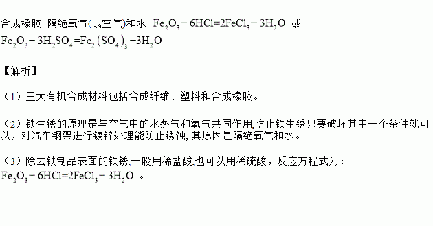 2019 央视春晚长春分会场将长春独特的汽车技术与“21世纪新材料之王”石墨烯技术相融合。演员身穿的发热服以及汽车制造中用到的材料有石墨烯、钢板、合成橡胶,其所用材料中属于有机合成材料的是_____________;对汽车钢架进行镀锌处理能防止锈蚀,其原因是________;镀锌前要用稀酸除去表面的铁锈(主要成分为Fe2O3),其化学反应方程式为__________(写出一个即可)