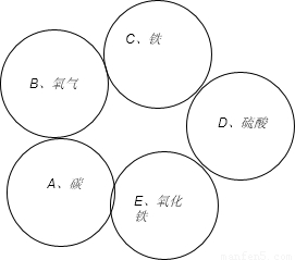 解答:解:C在B中剧烈燃烧,火星四射,生成黑色固体,所以C就是铁,B就是氧气,A能还原E,用两圆相切表示两种物质可以发生化学反应,所以A就是碳,E就是氧化铁,D就是硫酸