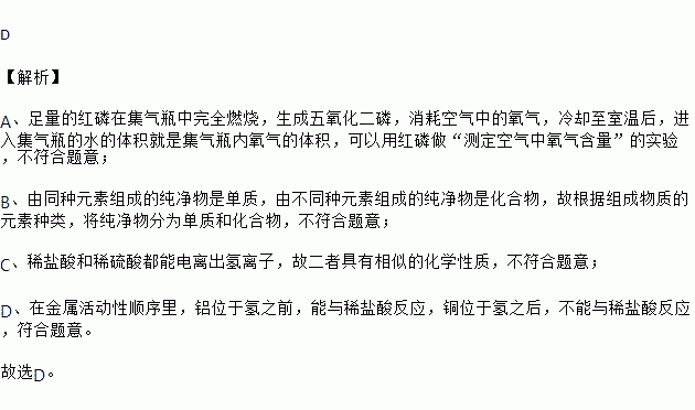 A | 实验法 | 用红磷做"测定空气中氧气含量"的实验 |