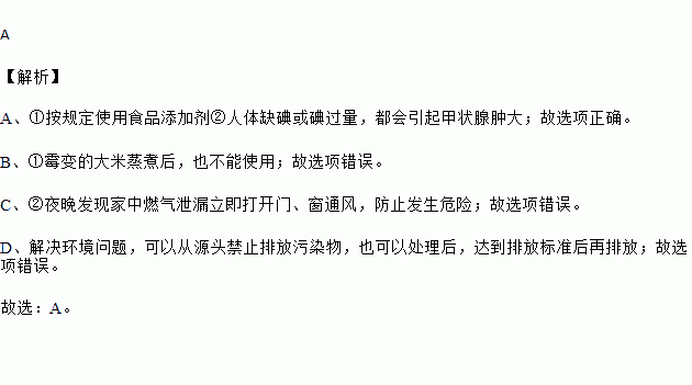 ①按规定使用食品添加剂 ②人体缺碘或碘过量,都会引起甲状腺肿大 | ①霉变的大米蒸煮后食用 ②鉴别棉织物和毛织物,可灼烧闻气味 |
