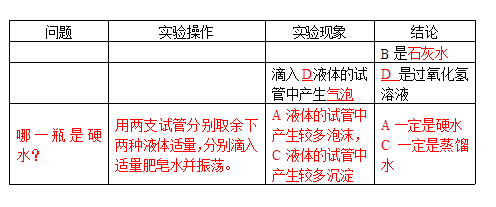 现有A、B、C、D四瓶无色液体,它们是蒸馏水、硬水、石灰水、过氧化氢溶液。为了确定它们各是哪一种,一同学做了有关实验。下表是他的实验报告的一部分,请你根据自己的分析判断将实验报告填写完整: