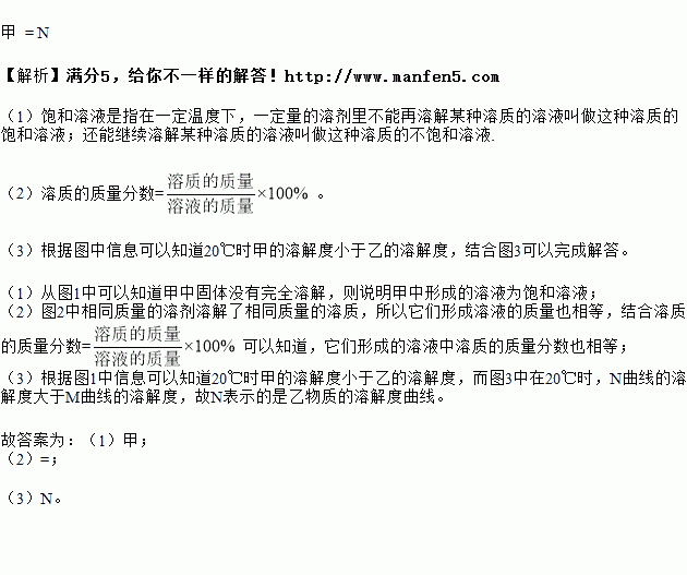 在20°C时,将等质量的A、B两种固体物质,分别加入到盛有100g水的烧杯中,充分搅拌后现象如图1,加热到50°C时现象如图2,A、B两种物质的溶解度曲线如图3。试根据图示回答下列问题:
