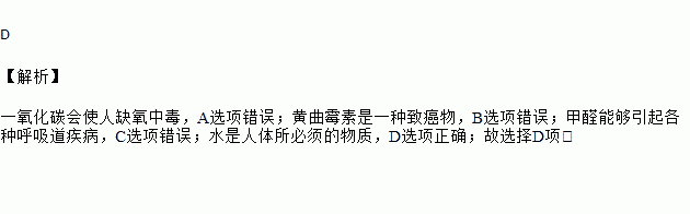 A.一氧化碳 B.黄曲霉素 C.甲醛 D.水