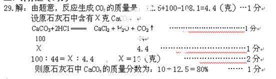 为了测定石灰石中含CaCO3 的质量分数,取石灰石12.5g 加入盛有100g 稀盐酸的烧杯中,两者恰好完全反应(假设杂质不和盐酸反应,也不溶解),烧杯内物质的质量变为108.1g ,计算石灰石中CaCO3 的质量分数。