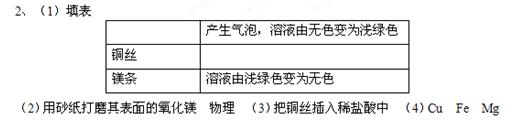 同学们一起探究镁、铁、铜三种金属的活动性,小刚同学设计了用铜丝、铁丝、镁条和稀盐酸,只用一只试管,取一次盐酸的探究方案。请你和他们一起完善下表的探究方案并回答有关问题。