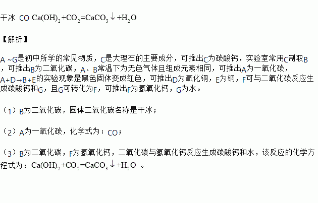 A ~G是初中所学的常见物质,其转化关系如图所示(部分反应物、生成物、反应条件已略去),A、B常温下为无色气体且组成元素相同,C是大理石的主要成分,实验室常用C制取B。A+D→B+E的实验现象是黑色固体变成红色。