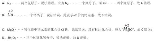 | C.MgO——氧化镁中镁元素的化合价+2价 | D.3H2O2——三个过氧化氢分子 |