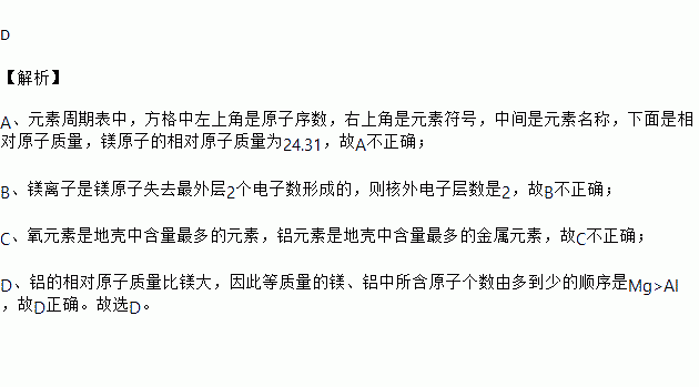 D.等质量的镁、铝中所含原子个数由多到少的顺序是Mg>Al