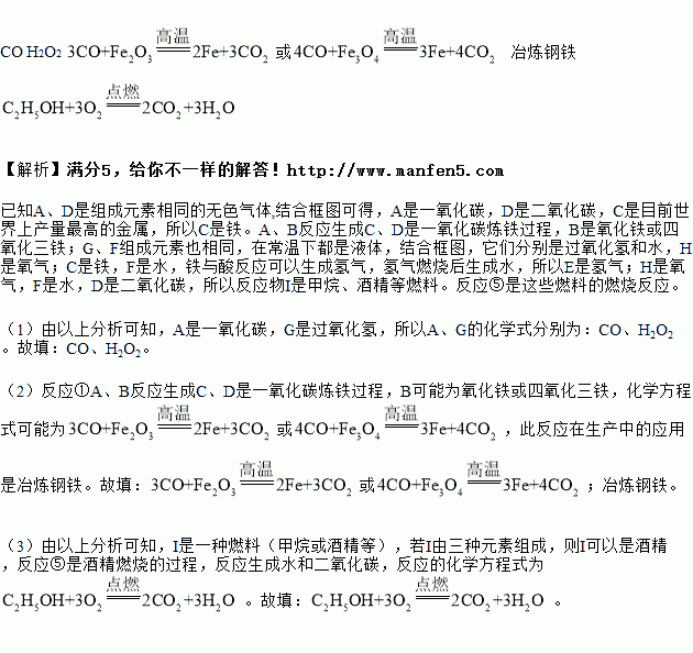 A-I是我们已学的常见物质,它们的相互转化关系如下图所示(有的反应条件、反应物和生成物未给出)。已知A、D是组成元素相同的无色气体;G、F组成元素也相同,在常温下都是液体;C是目前世界上产量最高的金属。