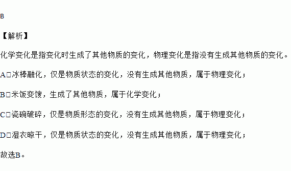 A.冰棒融化 B.米饭变馊 C.瓷碗破碎 D.湿衣晾干