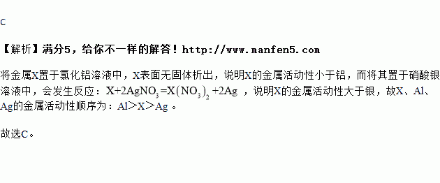 将金属X置于氯化铝溶液中,X表面无固体析出;而将其置于硝酸银溶液中,会发生反应:X + 2AgNO3 = X(NO3)2 + 2Ag。由此可判断X、Al、Ag的金属活动性顺序为( )