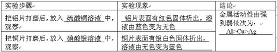 (7分)现有下列试剂:硝酸银溶液、硫酸铝溶液、硫酸铜溶液、铝片、铜片。某小组设计了下列实验方案,请你和他们一起探究银、铝、铜三种金属的活动性强弱。![]()