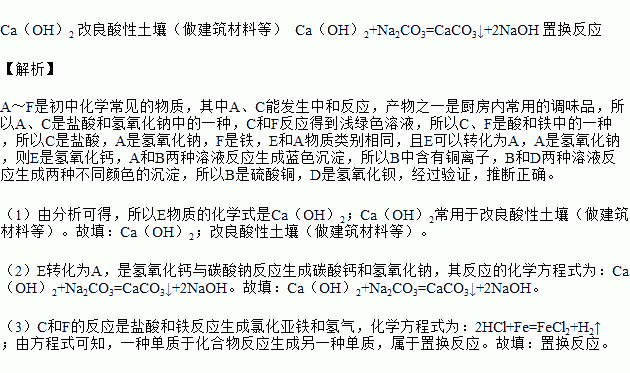 A~F 是初中化学常见的物质,其中 A、C 能发生中和反应,产物之一是厨房内常用调味品的主要成分; C 和 F 反应得到浅绿色溶液;A 和 B 两种溶液反应生成蓝色沉淀;A、D、E 物质类别相同,B 和 D 可以生成两种颜色的沉淀。各物质间的反应关系如图所示(图中“— 表示两端的物质能反应,“→”表示物质间存在转化关系,部分反应物和生成物及反应条件已略去)。请回答下列问题:
