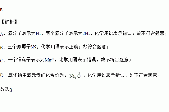 A. 两个氢分子: 2H B. 三个氮原子: 3N