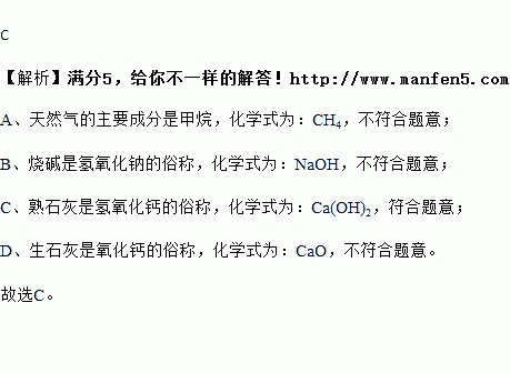 A.天然气:CO B.烧碱:Na2CO3 C.熟石灰:Ca(OH)2 D.生石灰:CaCO3