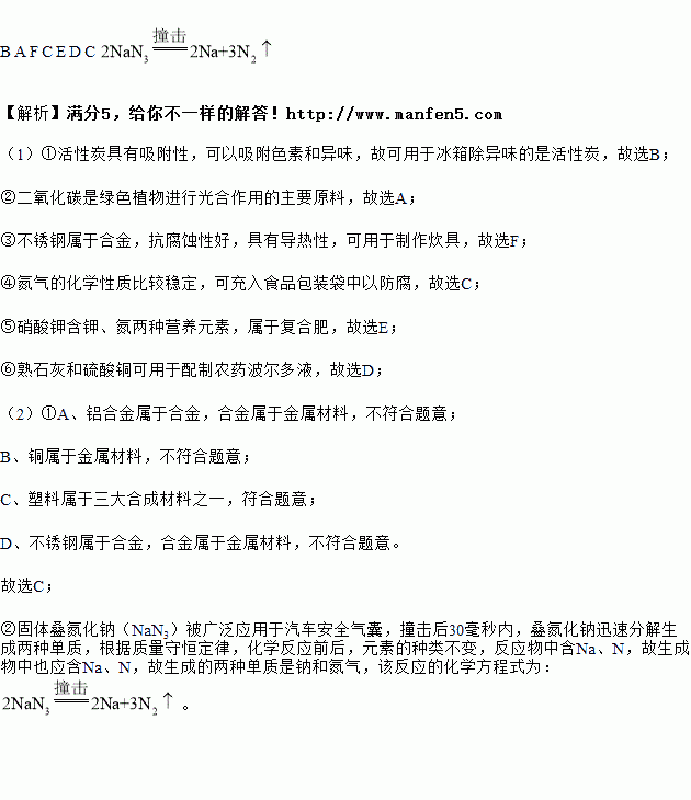 (1)一些物质在生活中有重要的用途。现有A 二氧化碳 B 活性炭 C 氮气 D 熟石灰 E 硝酸钾 F 不锈钢,选择适当的物质填空(填序号)。