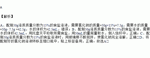 实验室欲配制50g溶质质量分数为15%的食盐溶液,下列说法不正确的是