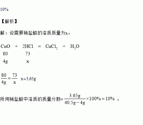 取4g氧化铜于烧杯中,向其中加入一定量的稀盐酸,恰好完全反应,得到溶液的质量为40.5g,计算:所用稀盐酸中溶质的质量分数__________。(写出计算过程)。