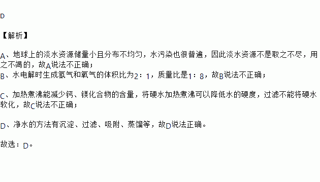 C.将硬水过滤可以得到软水 D.净水的方法有沉淀、过滤、吸附、蒸馏等