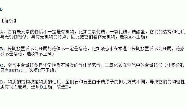 D.金刚石和石墨由于碳原子的排列方式不同,导致它们的物理性质有很大差异