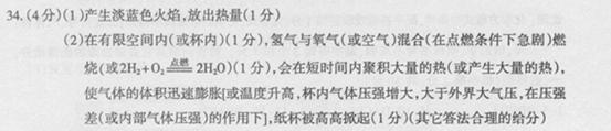 取一只纸杯,在底部开一小孔,倒置在实验桌上(倒置时纸杯下垫木条使纸杯的下边缘一端稍稍抬起),用纸团堵住小孔,先收集满氢气后,拿掉堵小孔的纸团.用燃着的长木条在小孔处点燃氢气。实验过程如图所示:
