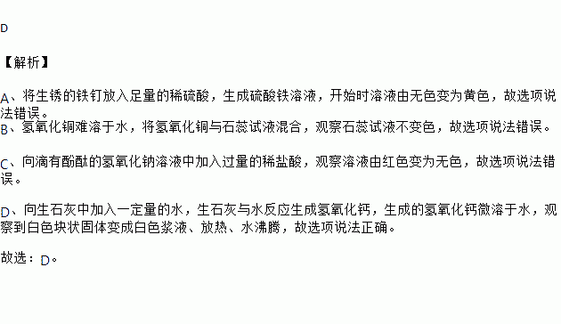 D.向生石灰中加入一定量的水,观察到白色块状固体变成白色浆液、放热、水沸腾。