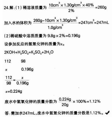 (2)向盛有20 g废水的锥形瓶中逐滴滴加2%的稀硫酸,至恰好完全反应。将实验所得数据绘制成右图所示图象。求废水中氢氧化钾的质量分数?![]()