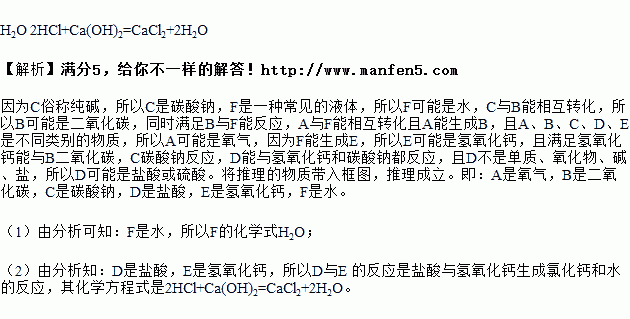 A~F 为初中化学常见的六种物质,且都含有一种相同元素,它们相互间的关系如图所示(→表示转化关系,—表示相互之间会反应)。己知 A、B、C、D、E 是不同类别的物质,C 俗称纯碱, F 是一种常见的液体。(部分反应物、生成物及反应条件己略去) 请回答: