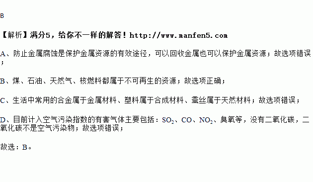 B | 化学与环境 | ①为治理雾霾,禁止使用化石燃料 ②为节约和环保,分类回收生活垃圾 |