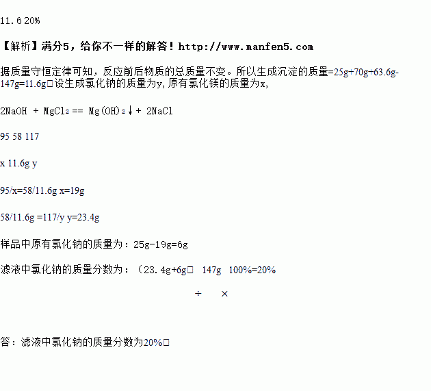 镁在国产大飞机C-919”的制造中大显身手,小亮在实验室模拟“海水制镁”的原理来富集镁,他将25g氯化钠和氯化镁的固体混合物全部溶解于盛有70g水的烧杯中,然后向其中加入63.6g氢氧化钠溶液至恰好完全反应(图像如下),过滤,称量滤液质量为147g,求:
