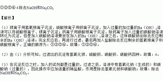 ①加过量 Ba(OH)2 溶液;②过滤;③加过量 Na2CO3 溶液;④加适量稀盐酸。