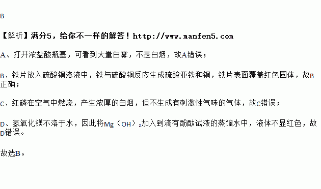 C.红磷在空气中燃烧,产生浓厚的白烟,生成有刺激性气味的气体 D.将Mg(OH)2加入到滴有酚酞试液的蒸馏水中,液体显红色