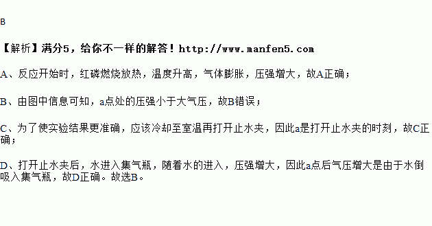 在利用红磷燃烧测定空气中氧气含量的实验中,用传感器记录集气瓶中 压强、温度随时间变化的情况,如图所示。其中 a 是打开止水夹的时刻。下列说法不正确的是( )