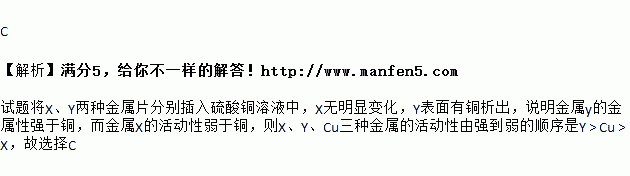 现将X、Y两种金属片分别插入硫酸铜溶液中,X无明显变化,Y表面有铜析出,则X、Y、Cu三种金属的活动性由强到弱的顺序是