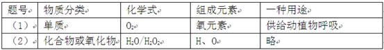 (6分)完成下表:(“物质分类”一栏可填:“单质”、“化合物”或“氧化物”)略